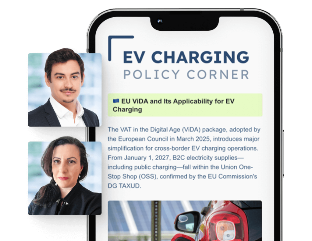 The VAT in the Digital Age (ViDA) package, adopted by the European Council in March 2025, introduces major simplification for cross-border EV charging operations. From January 1, 2027, B2C electricity supplies